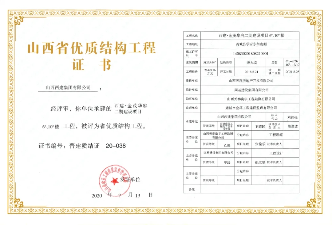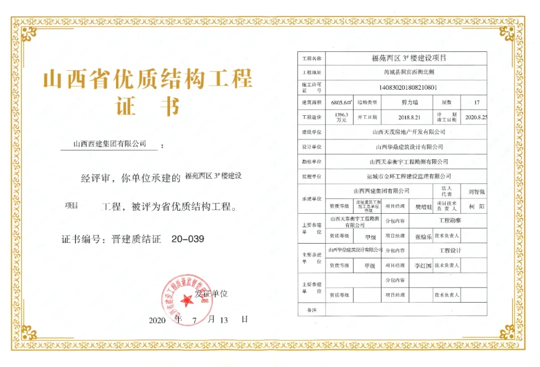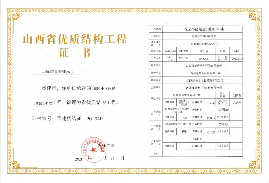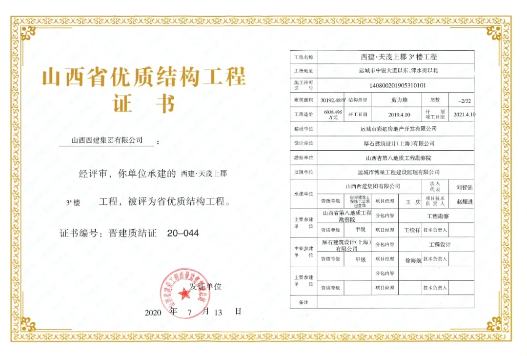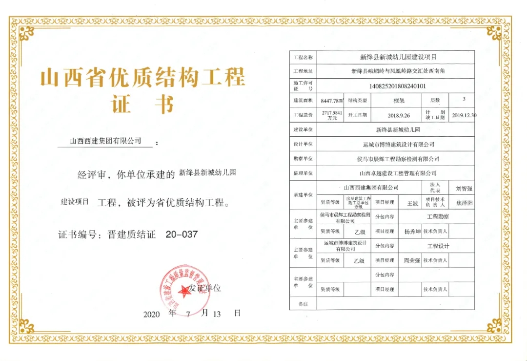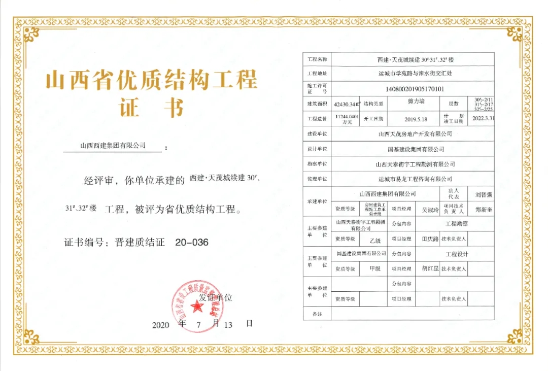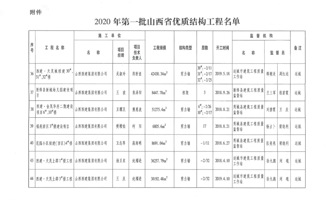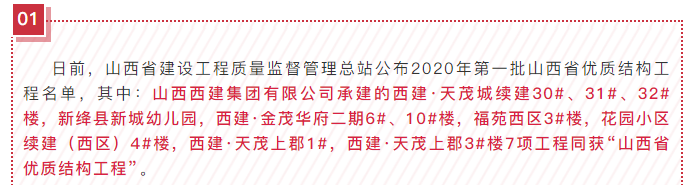 日前,山西省建設工程質量監督管理總站公布2020年第一批山西省優質結構工程名單,其中:山西西建集團有限公司承建的西建·天茂城續建30#、31#、32#樓,新絳縣新城幼兒園,西建·金茂華府二期6#、10#樓,福苑西區3#樓,花園小區續建(西區)4#樓,西建·天茂上郡1#,西建·天茂上郡3#樓7項工程同獲“山西省優質結構工程”。